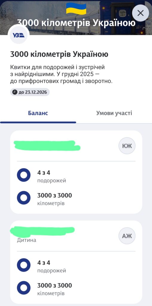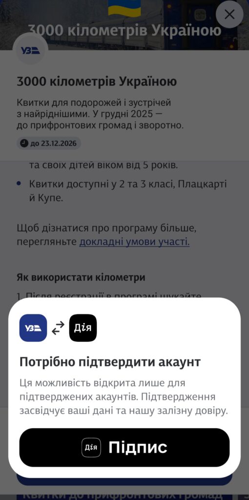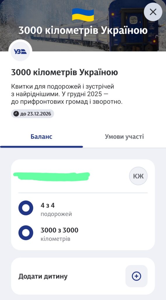 6️⃣ Також можна додати дитину. Для цього слід у застосунку УЗ зайти в банер 3000. Натиснути “Додати дитину”. Далі пройти авторизацію через Дію. Дитина автоматично підтягнеться із даних застосунка Дія. І надалі висвітяться кількість доступних поїдок та кілометрів на вас та дитину.