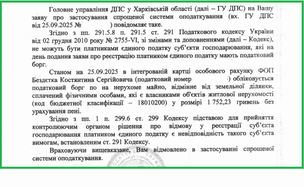 Чи можуть відмовити у реєстрації ФОП на спрощеній системі оподаткування, якщо є податковий борг з податку на нерухомість?
