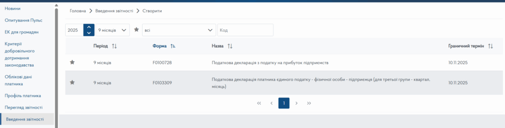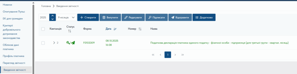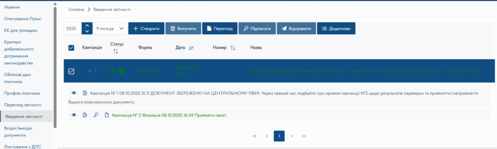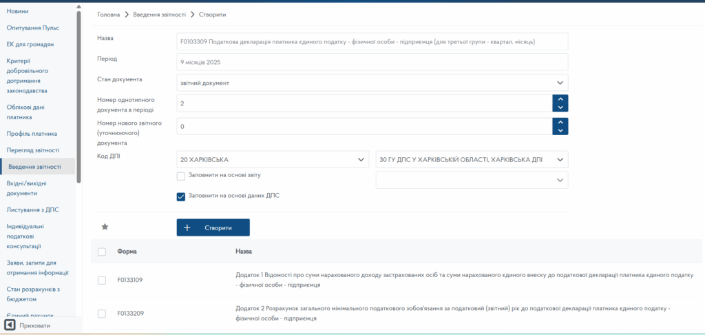 В розділу Введення звітності Електронного кабінету платника податків від ДПС оберіть 2025 рік та 9 місяців. Натискаємо Створити.