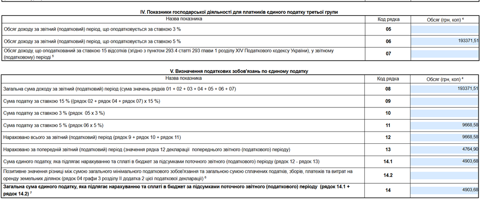 В рядок 13 автоматично підтягнеться сума єдиного податку з минулої декларації (за півріччя 2025 року). Тому тільки вкажіть суму доходу усього за 9 місяців 2025 року (не окремо за третій квартал, а повністю за перший + другий + третій квартал) – в рядку 06. І решта рядків заповнюється автоматично. Перевірте правильність.