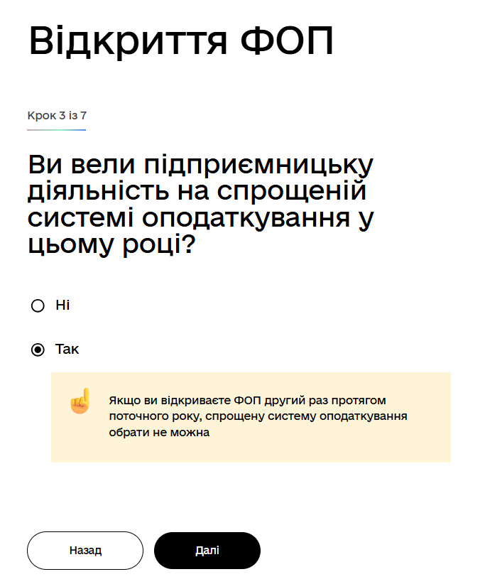 Подаючи заяву на реєстрацію ФОП, ви помічаєте, Чи вели підприємницьку діяльність на спрощеній системі оподаткування у цьому році?