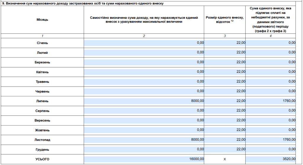 3️⃣ У рядку «Усього» п. 9 — загальна сума внеску за період.