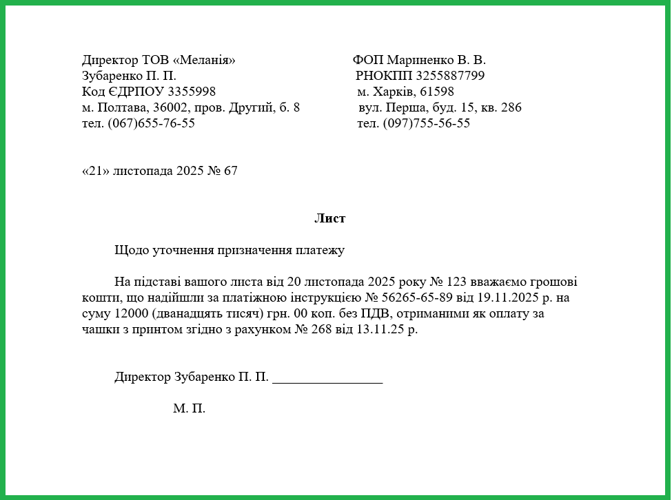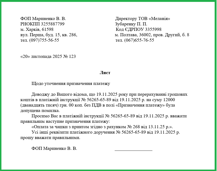 📝 Що робити продавцю, якщо клієнт перерахував оплату і не заповнив призначення платежу. Або заповнив, але неправильно? Чи можна якось виправити? Потрібен лист-уточнення. Його приклад є у статті.