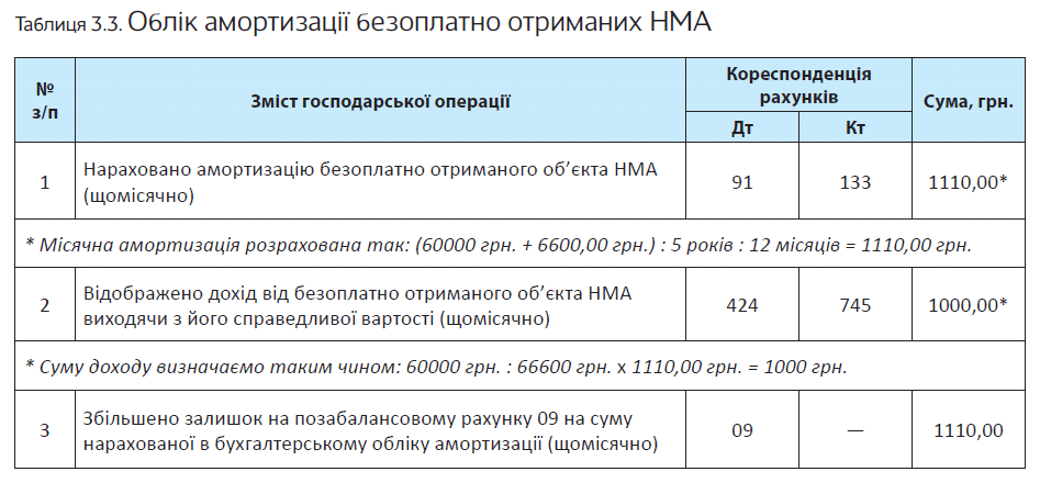 - Щомісячно одночасно з нарахування амортизації безоплатно отриманих об’єктів НМА в обліку підприємства визнають дохід у сумі, пропорційній нарахованій амортизації.