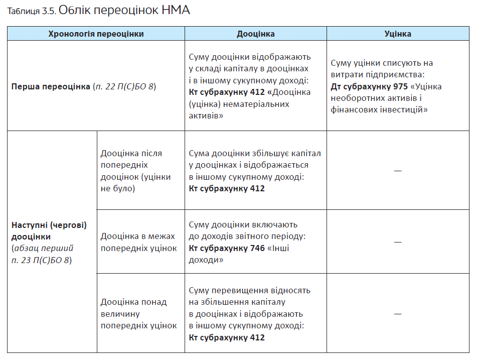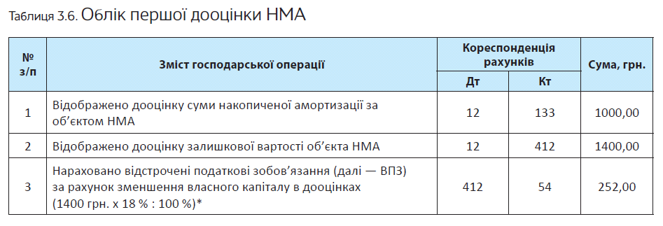 У бухгалтерському обліку першу дооцінку НМА відображають таким чином (див. табл. 3.6):