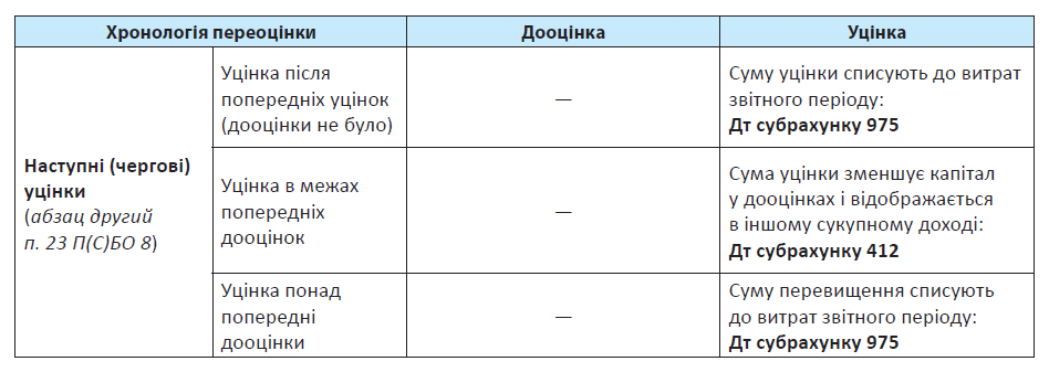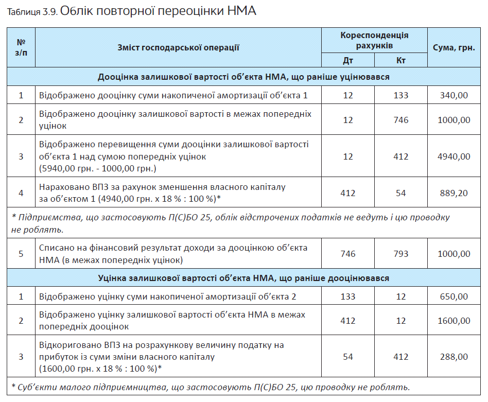 На рахунках бухгалтерського обліку операції з уцінки і дооцінки раніше переоцінених об’єктів НМА будуть відображені таким чином (див. табл. 3.9):