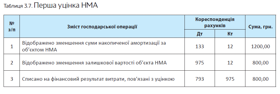 Першу уцінку НМА в бухгалтерському обліку відображають таким чином (див. табл. 3.7):