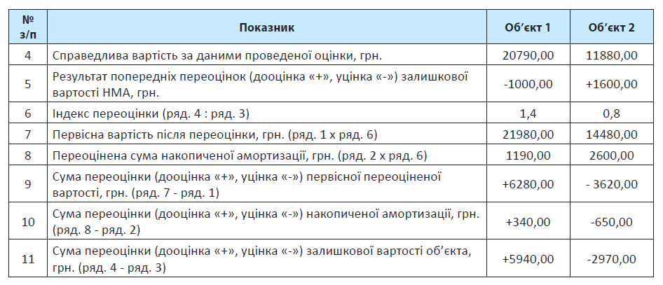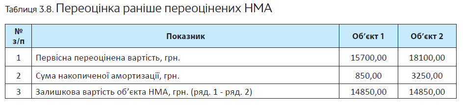 Приклад 3.8. Дооцінка (уцінка) раніше переоцінених НМА. На балансі підприємства обліковується два об’єкти НМА, щодо яких прийнято рішення про переоцінку. Початкові дані для розрахунку суми переоцінки, а також результати її проведення представимо в табл. 3.8.