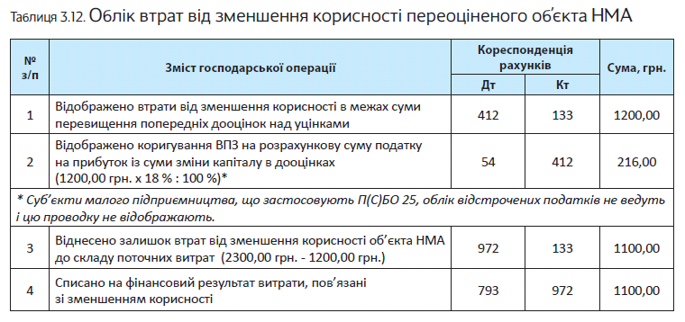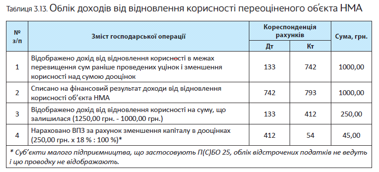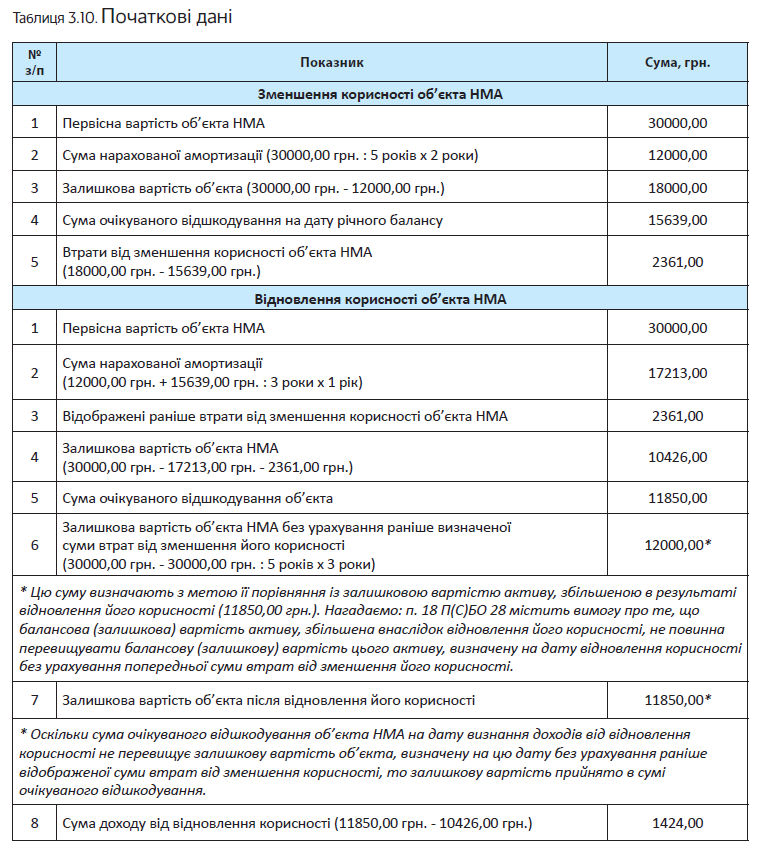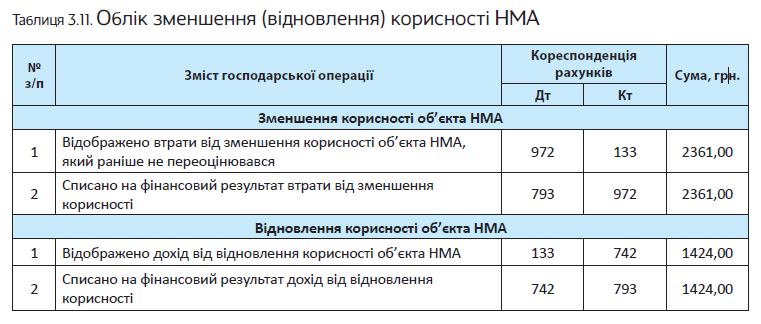 У бухгалтерському обліку втрати від зменшення корисності і дохід від відновлення корисності об’єкта НМА будуть відображені таким чином (див. табл. 3.11 на с. 63):