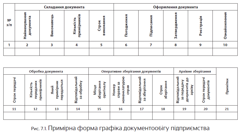 Відповідно до п. 5.3 Положення № 88 графік документообігу оформляють у вигляді схеми або переліку робіт зі створення, перевірки та обробки документів, які виконуються кожним підрозділом підприємства, а також усіма виконавцями із зазначенням їх взаємозв’язку і термінів виконання робіт. При цьому на практиці його часто складають у табличній формі. Як це може виглядати, пропонуємо поглянути на рис. 7.1. Крім того, ви можете взяти за основу приклад графіка документообігу, наведений у додатку до Положення № 105.