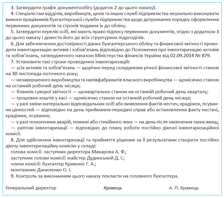 - Підприємство визначає перелік осіб, які мають право підписувати бухгалтерські документи, і доводить його до своїх структурних підрозділів.