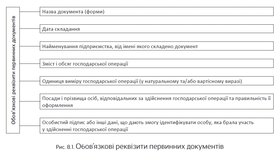 Первинні документи мають юридичну силу і доказовість як у бухгалтерських, так і в податкових цілях (а іноді й з метою вирішення судових спорів) тільки за наявності обов’язкових реквізитів. Перелік обов’язкових реквізитів первинних документів містять ч. 2 ст. 9 Закону № 996 і п. 2.4 Положення № 88. Узагальнено наведемо його на рис. 8.1.