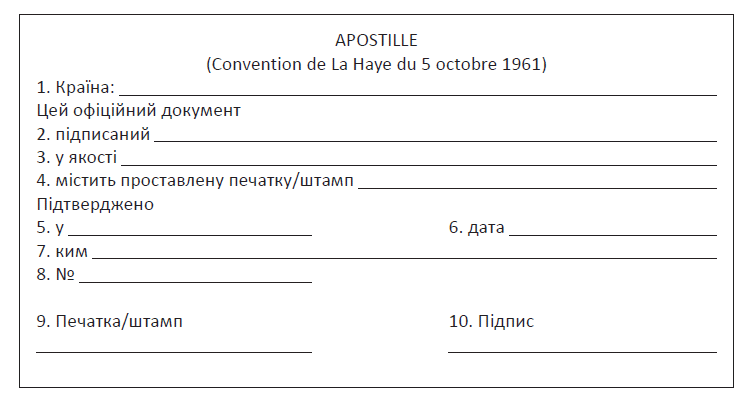 Назву апостилю незалежно від мови, якою він складений, завжди викладають французькою мовою таким чином: «Apostille (Convention de la Haye du 5 octobre 1961)»