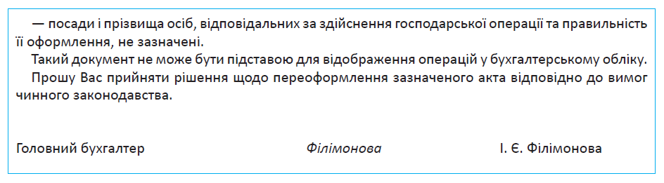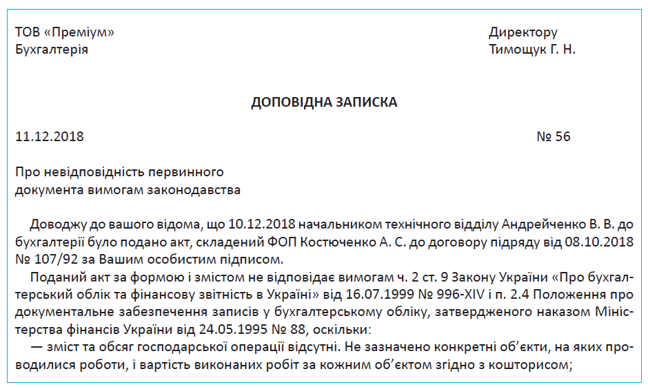 Нижче наведемо приклад доповідної записки на ім’я директора, що інформує про невідповідність первинного документа вимогам законодавства.