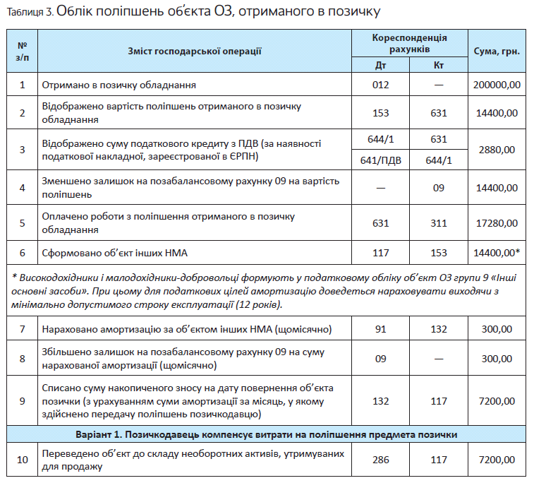 Проте зауважте: усе це справедливо тільки для випадку, коли об’єкт, отриманий у позичку, використовується в господарській діяльності підприємства. Інакше сформувати в податковому обліку «поліпшувальний» об’єкт ОЗ і нараховувати за ним амортизацію не вийде. Виною тому п.п. 138.3.2 ПКУ, згідно з яким
