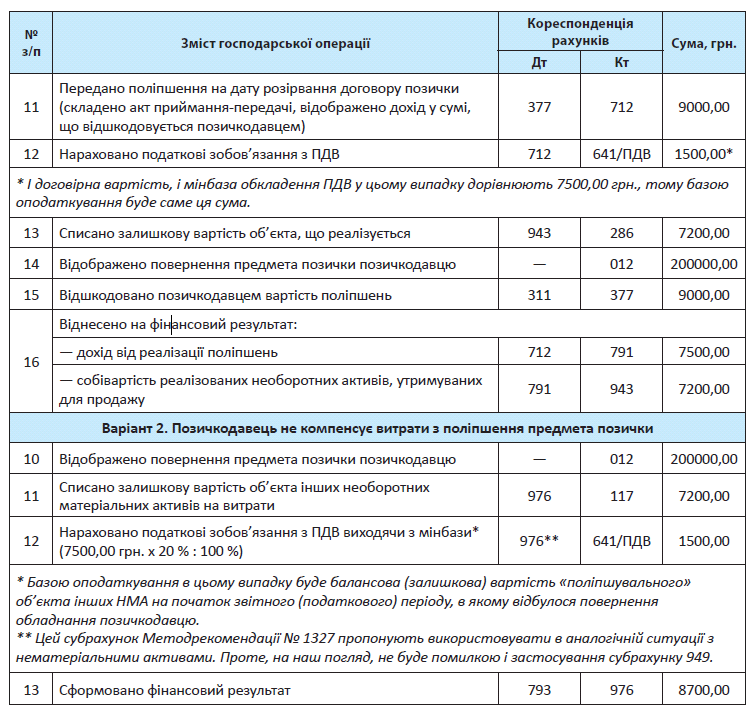 Крім того, операція з передачі поліпшень позичк одавцю без їх компенсації (тобто безкоштовно) прирівнюється до постачання (п.п. 14.1.191 ПКУ). Тому користувач — платник ПДВ у такому разі нараховує податкові зобов’язання з ПДВ з урахуванням вимог абзацу другого п. 188.1 ПКУ. Тобто базою оподаткування буде залишкова вартість поліпшень за даними бухобліку, що склалася станом на початок звітного періоду, в якому здійснювалася передача поліпшеного об’єкта ОЗ. Такого висновку дійшли фіскали в листі ДФСУ від 05.11.2015 р. № 23622/6/9999-19-03-02-15* стосовно повернення орендодавцеві предмета оренди. Вважаємо, так само слід чинити й у випадку з договором позички.