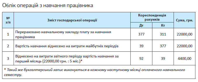 Приклад. Підприємство в січні 2018 року оплатило 5 місяців навчання працівника бухгалтерії в українському вищому навчальному закладі. Вартість навчання становить 22000 грн.