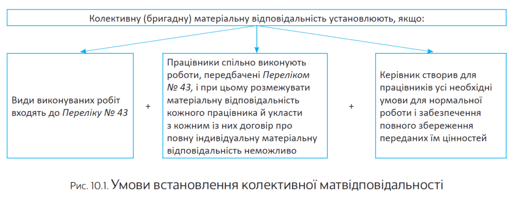 Договір про колективну (бригадну) матеріальну відповідальність укладають між підприємством і всіма членами колективу (бригади) письмово (ч. 2 ст. 1352 КЗпП). Проте знайте: таку матеріальну відповідальність можна встановити, тільки якщо одночасно дотримуються умови, передбачені п. 2 наказу № 43 (див. рис. 10.1 на с. 97).