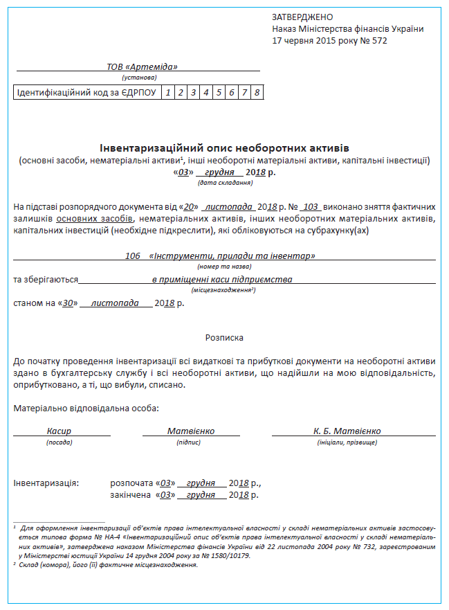 — Інвентаризаційний опис необоротних активів, затверджений наказом № 572.