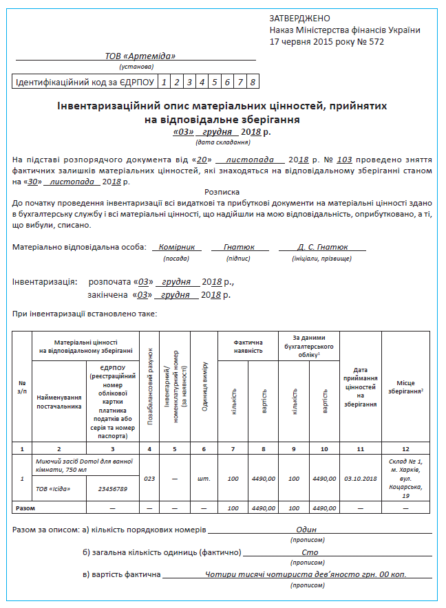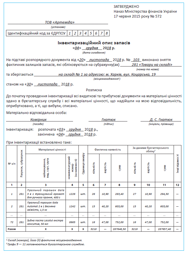 На с. 35 наведемо зразок заповнення Інвентаризаційного опису запасів, затвердженого наказом № 572*.