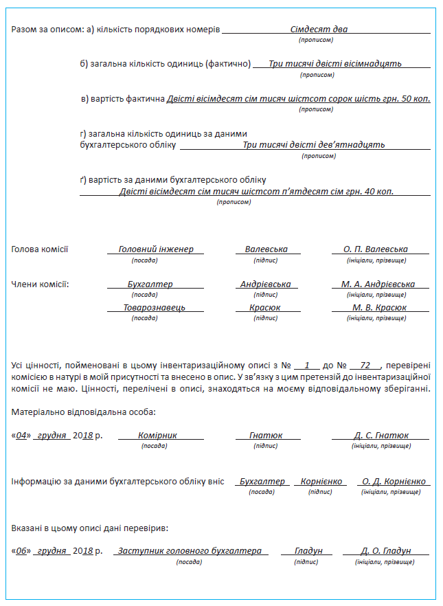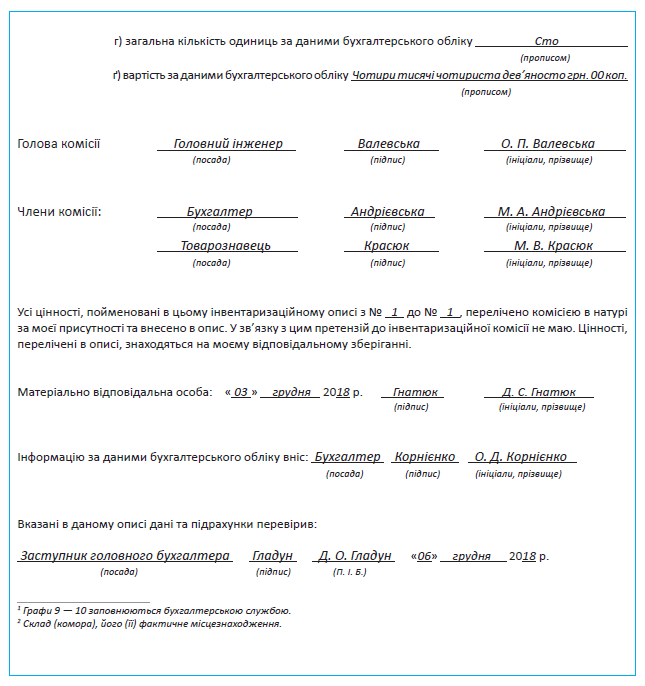 Оформлені й підписані всіма членами інвентаризаційної комісії (робочої інвентаризаційної комісії) і матеріально відповідальною особою інвентаризаційні описи передають до бухгалтерії.
