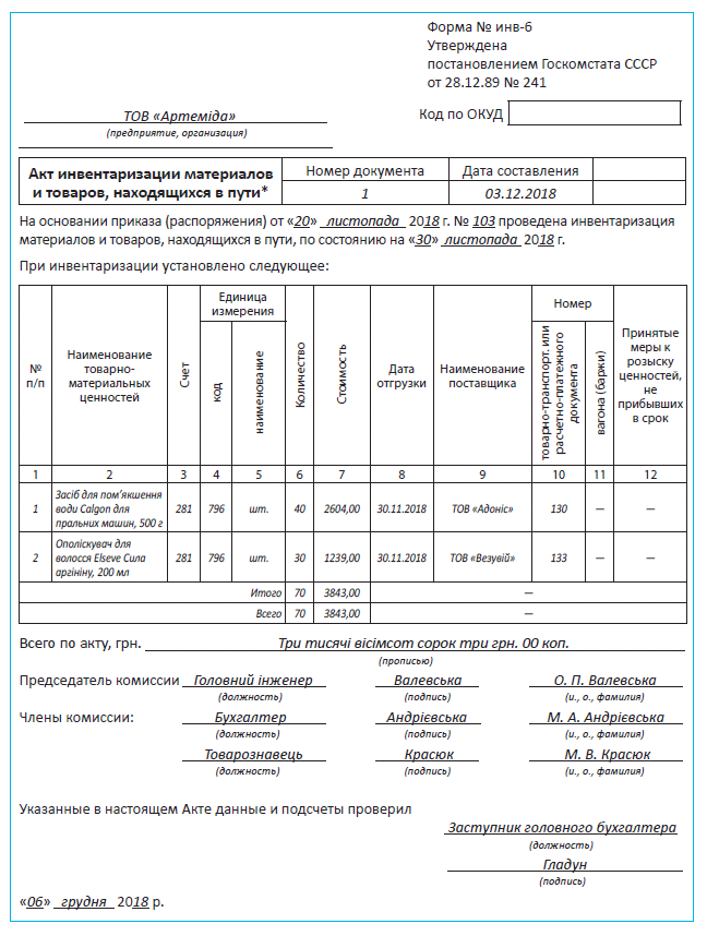 1) ТМЦ, які перебувають у дорозі (наприклад, на ті, що відвантажені постачальником і не надійшли на підприємство на дату проведення інвентаризації). У цьому випадку можна скласти Акт інвентаризації матеріалів і товарів, що перебувають у дорозі, за формою № инв-6, затвердженою постановою № 241;