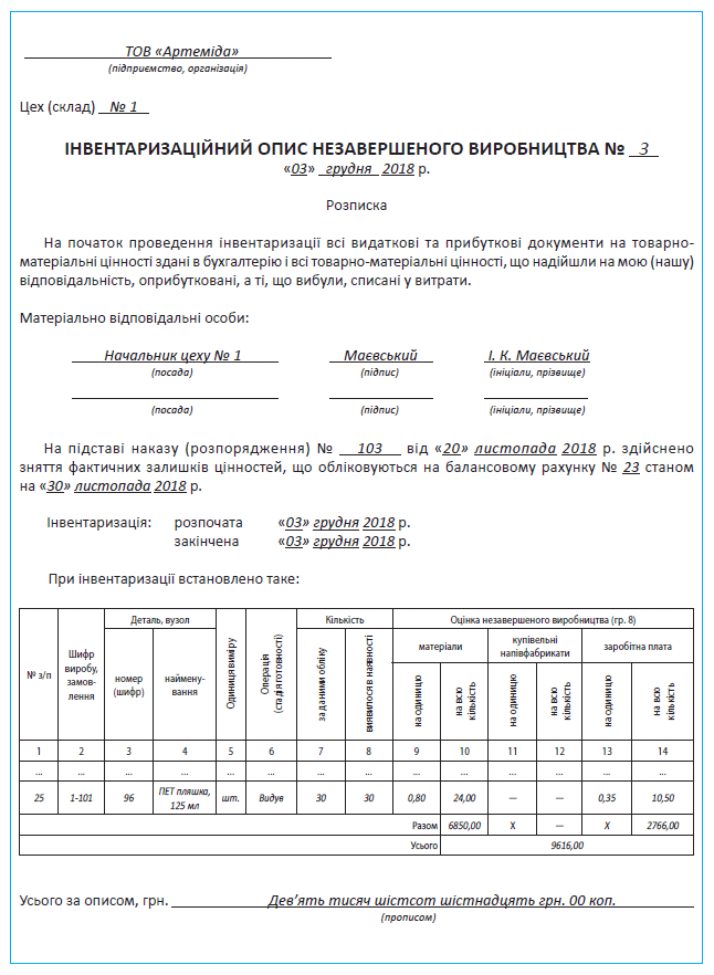 На жаль, типової форми інвентаризаційного опису НЗВ зараз не існує. Тому кожне підприємство самостійно встановлює порядок інвентаризації НЗВ з урахуванням специфіки свого виробництва і галузевих інструкцій з питань планування, обліку та калькулювання собівартості продукції, а також розробляє індивідуальний інвентаризаційний опис.