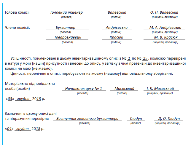 На с. 43 наведемо для вас зразок заповнення інвентаризаційного опису НЗВ, узявши за основу типову форму № инв-7.