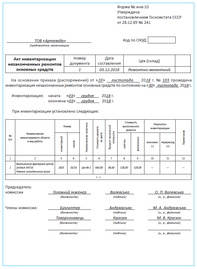 Зразок заповнення Акта інвентаризації незавершених ремонтів основних засобів за формою № инв-10 ви можете побачити на с. 46.