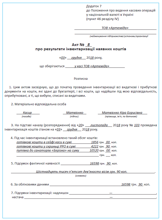 В Акті зазначають дані про фактичний залишок грошових коштів та інших цінностей у касі підприємства, а також їх залишок за даними бухгалтерського обліку і визначають результат інвентаризації.