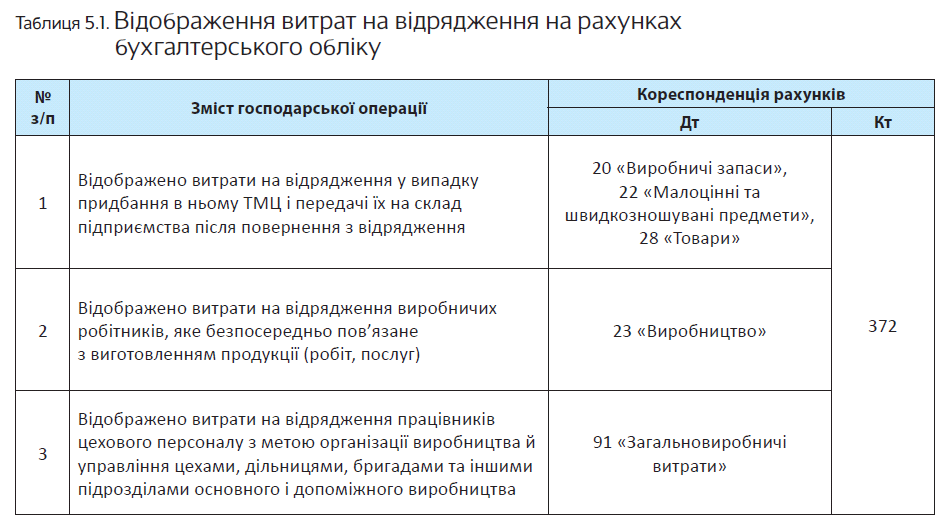 Залежно від мети відрядження, визначеної керівником підприємства у відповідному наказі, і підрозділу, в якому працює відряджений працівник, суми витрачених підзвітними особами коштів відображають на таких рахунках бухгалтерського обліку (див. табл. 5.1):