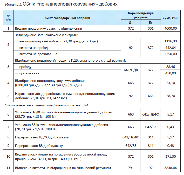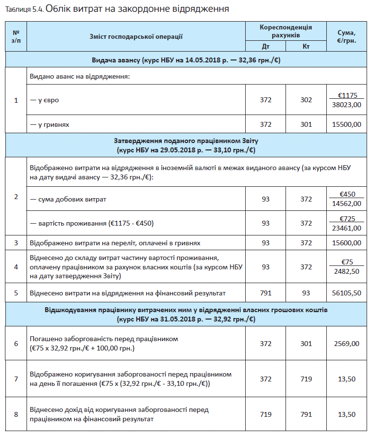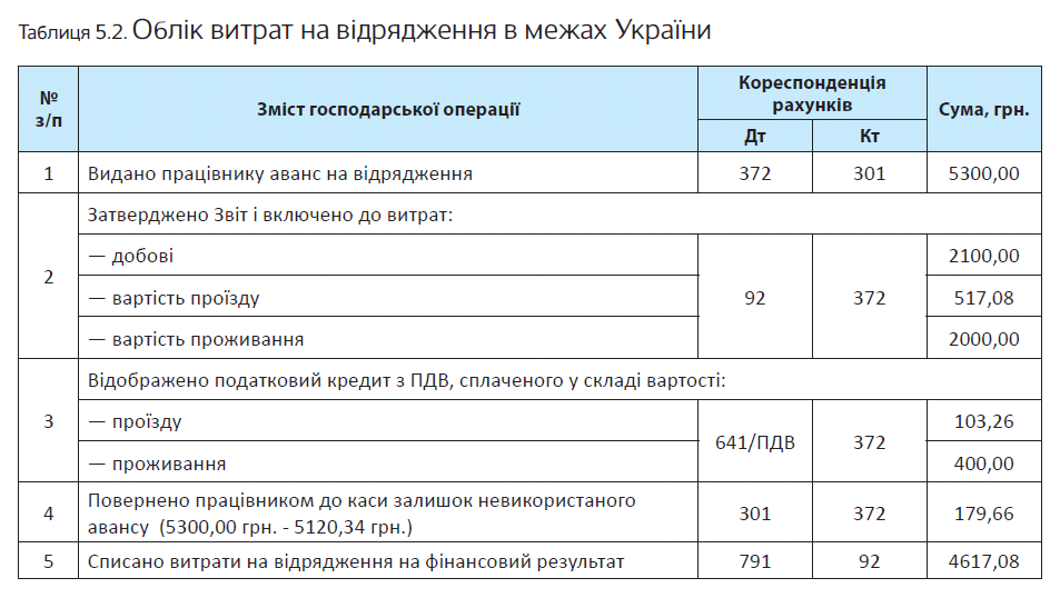 Як такі витрати на відрядження відобразити в обліку підприємства, ви можете побачити в табл. 5.3.