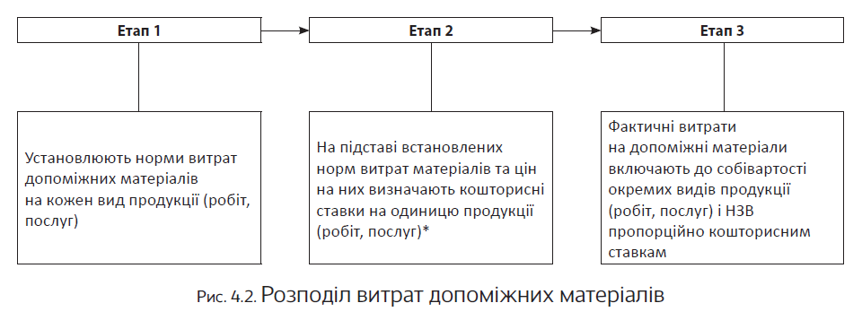 Витрати допоміжних матеріалів, що використовуються при виготовленні продукції (робіт, послуг) і для забезпечення виробничого процесу, обліковують загалом так само, як і основних. Проте якщо безпосереднє віднесення їх до собівартості конкретних видів продукції ускладнено, вартість використаних допоміжних матеріалів розподіляють непрямим шляхом у такому порядку (див. рис. 4.2):