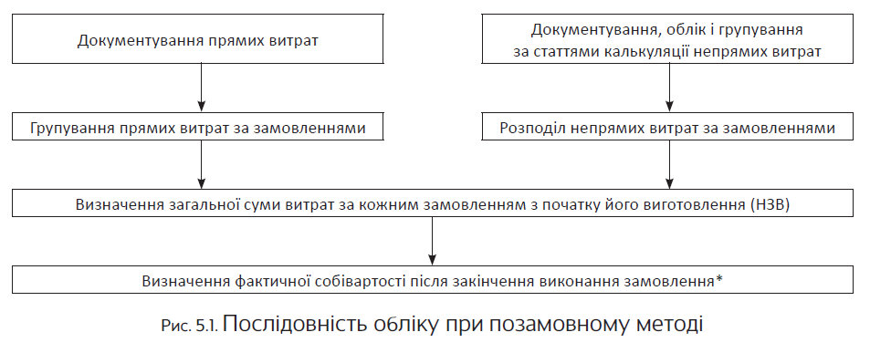 Цікаво, що в індивідуальному і дрібносерійному виробництвах позамовний метод можна застосовувати з використанням основних елементів нормативного обліку витрат на виробництво (про нього див. на с. 29). У цьому випадку всі витрати на виробництво обліковують за окремими замовленнями з розподілом на витрати за нормами і відхиленням від них. Фактичну собівартість продукції визначають після виконання замовлення підрахунком витрат за нормами і відхиленням від них, як при нормативному методі обліку витрат.