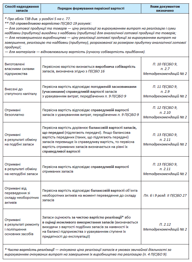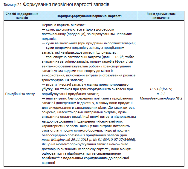 Є різні шляхи, якими запаси надходять на підприємство. Проте в будь-якому разі такі активи зараховують на баланс за первісною вартістю (п. 8 П(С)БО 9). Це загальне правило для всіх запасів. Тому важливо розуміти, як первісна вартість формується в кожному конкретному випадку. Відповідь на це запитання див. у табл. 2.1.