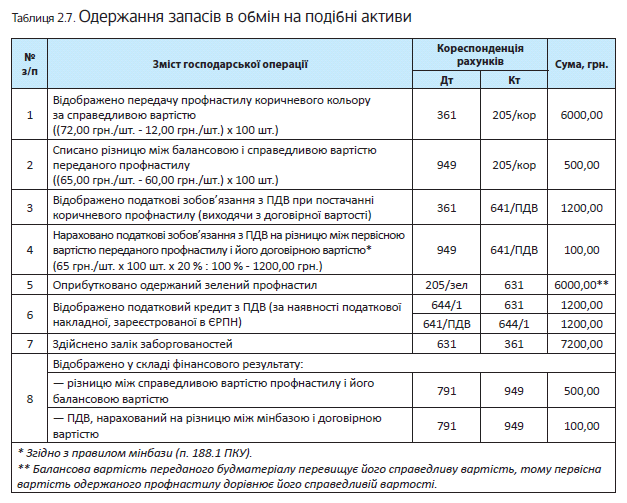 Приклад 2.4. Обмін подібними запасами. Підприємство здійснює обмін 100 листів коричневого профнастилу товщиною 0,4 мм, що обліковується у складі будівельних матеріалів, на таку ж кількість зеленого профнастилу товщиною 0,4 мм. Справедлива вартість профнастилу, що обмінюється, однакова і становить 72,00 грн. за 1 лист (у тому числі ПДВ — 12,00 грн.). Первісна вартість профнастилу, що передається за договором, без урахування ПДВ — 65,00 грн. за 1 лист.