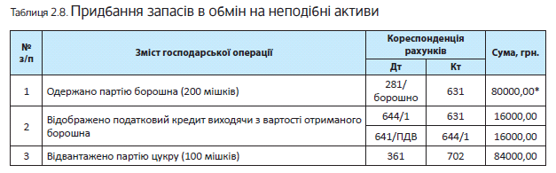 Підприємство отримує за договором міни 200 мішків борошна вищого ґатунку за ціною 480,00 грн./міш. (у тому числі ПДВ — 80,00 грн.).