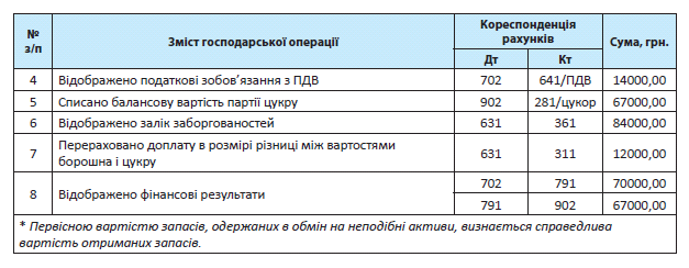 Натомість підприємство передає 100 мішків цукру за ціною 840,00 грн./міш. (у тому числі ПДВ — 140,00 грн.). Таким чином, без урахування ПДВ вартість борошна, що отримано за бартером, становить 80000,00 грн. (400,00 грн./міш. х 200 міш.), а вартість переданого цукру — 70000,00 грн. (700,00 грн./міш. х 100 міш.). Різницю між вартостями товарів підприємство доплачує грошовими коштами. Первісна вартість цукру, що передається, становить 67000,00 грн. (без ПДВ).