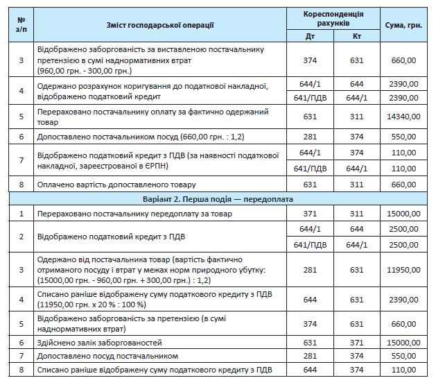 У разі коли постачальник згідно з пред’явленою йому претензією допоставить товар, якого не вистачає, у ПДВ-обліку сторін госпоперації нічого не змінюється, адже перша подія (передоплата) не змінилася. Якщо ж передоплата буде повернена, то на цю дату продавець складає «зменшуючий» розрахунок коригування, який реєструє покупець. На підставі такого документа покупець зменшить податковий кредит з ПДВ.