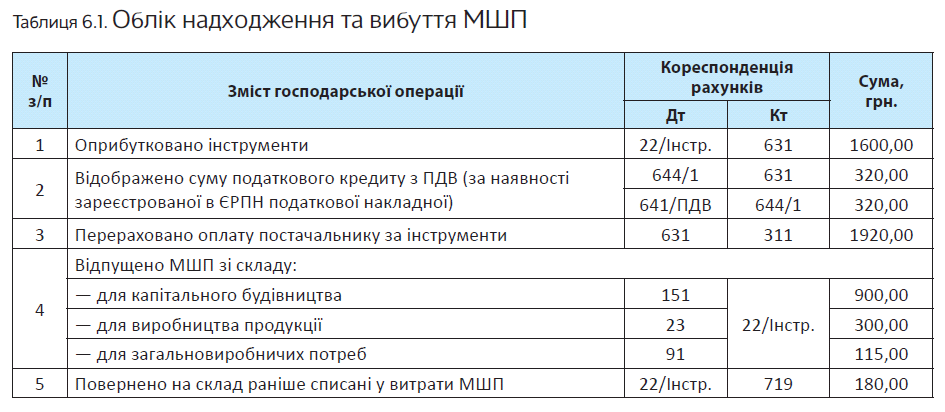 Приклад 6.1. Підприємством у звітному періоді придбано інструменти на суму 1920,00 грн., у тому числі ПДВ — 320,00 грн.