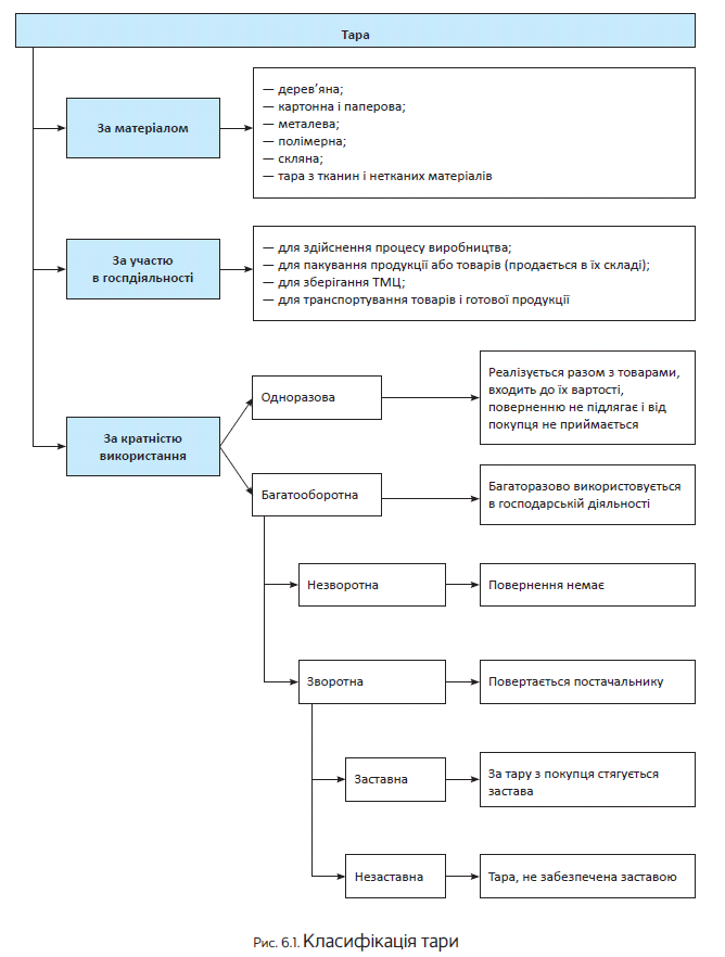 Тара може бути різною. Вона класифікується залежно від кратності використання, матеріалу виготовлення, участі у виробничому процесі тощо. Більше про види тари розповість рис. 6.1 на с. 87.