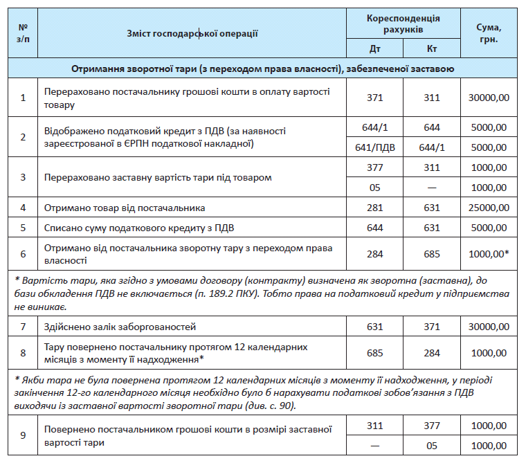 А якщо договором передбачено перехід права власності? Тоді звернемо увагу на п. 189.2 ПКУ. Відповідно до нього вартість тари, що визначена договором як зворотна (заставна)**, не включається до бази обкладення цим податком. Тому при отриманні такої тари шансів на податковий кредит у підприємства-одержувача немає.