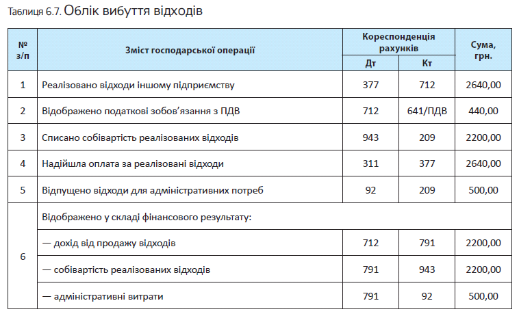 Першу групу відходів реалізовано іншому підприємству на суму 2640,00 грн. (у тому числі ПДВ — 440,00 грн.). Другу — використано для адміністративних потреб.