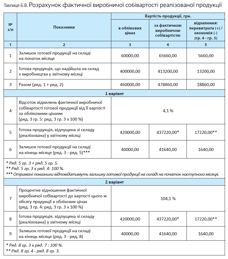 Порядок розрахунку фактичної виробничої собівартості готової продукції, відпущеної зі складу протягом місяця, а також її залишку на кінець місяця ви можете побачити в табл. 6.8 на с. 104.