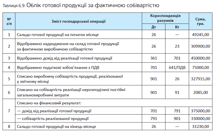 Приклад 6.9. Підприємство веде облік готової продукції за фактичною собівартістю з відображенням собівартості реалізації одноразово наприкінці місяця.