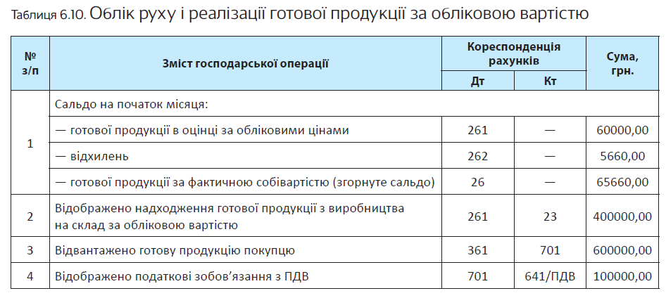 Відображення в обліку операції з оприбуткування і реалізації готової продукції покажемо в табл. 6.10.