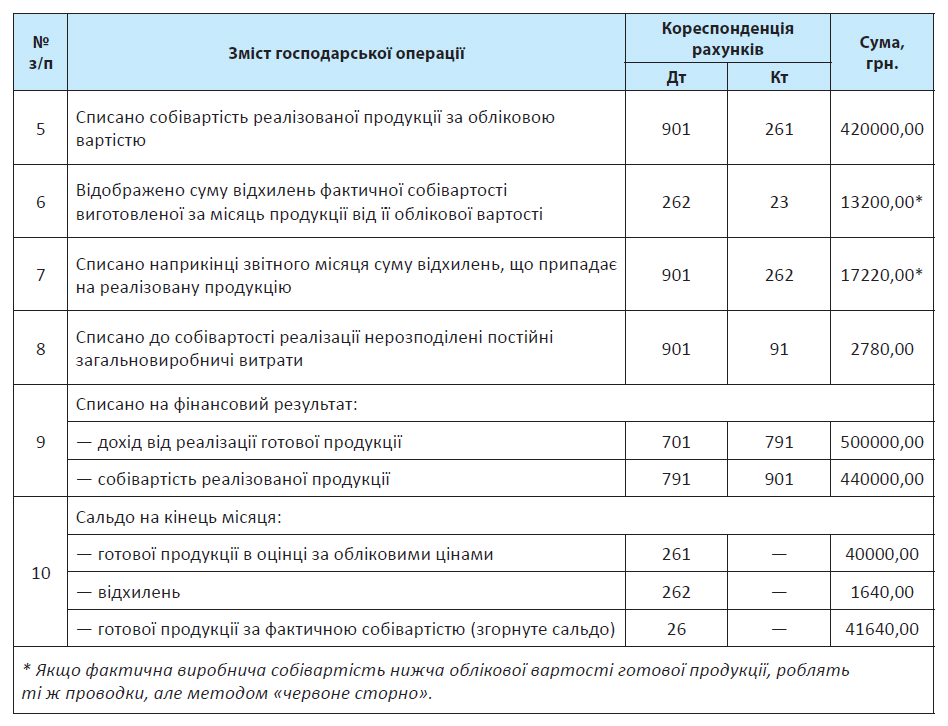 Як ми зазначали вище, застосування оцінки руху готової продукції за обліковою вартістю передбачає визначення й облік відхилень фактичної виробничої собівартості готової продукції від її вартості за обліковими цінами. У такому разі відхилення можна відображати на окремому субрахунку рахунка 26. Це дозволяє в межах одного рахунка отримувати фактичну собівартість продукції і дані про вартість продукції за обліковими цінами.