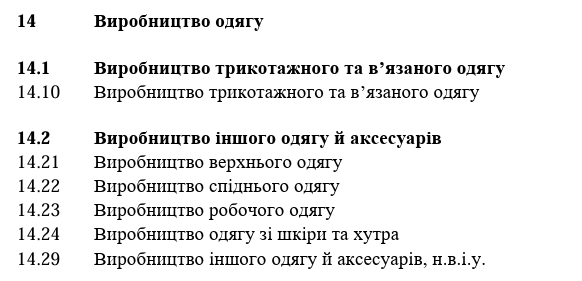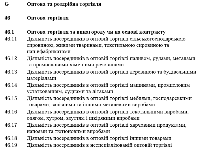 Наприклад, оптова торгівля так і залишається розділ 46, зокрема, залишаться незмінними КВЕДи 46.41 – Оптова торгiвля текстильними товарами, 46.42 – Оптова торгiвля одягом i взуттям, 46.93 – Неспецiалiзована оптова торгiвля.