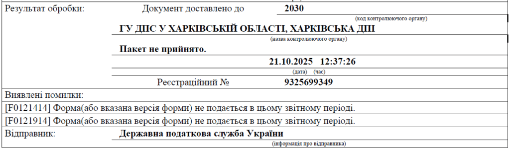 🔴 А якщо спробувати подати до закінчення місяця ліквідації? Отримаєте відмову – червону квитанцію з “вердиктом” – “Пакет не прийнято”.