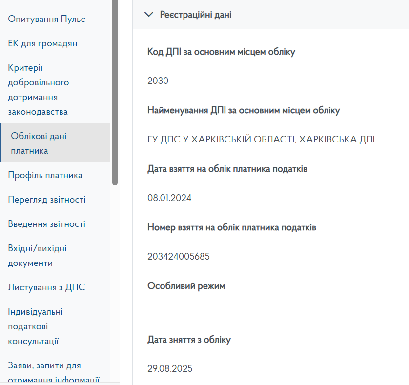 Слід перевірити дату зняття з обліку (дату анулювання) у розділі Облікові дані платника 👇 (на прикладі – це серпень).